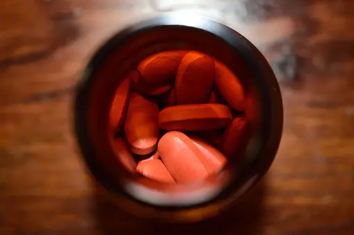 Un bote de cristal que contiene píldoras de color naranja